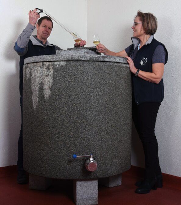 Wir sind stolz auf unsere, im Steinfass vinifizierten Weine. Durch den Kontakt mit der grossen rauen Oberfläche des Granits und direktem Sauerstoffaustausch werden die spitzigen Säurestrukturen verfeinert, während die Frische und Fruchtigkeit erhalten bleibt. Aus dieser Ausbauart resultieren die viligranen Granit Weine mit edler Stilistik.
